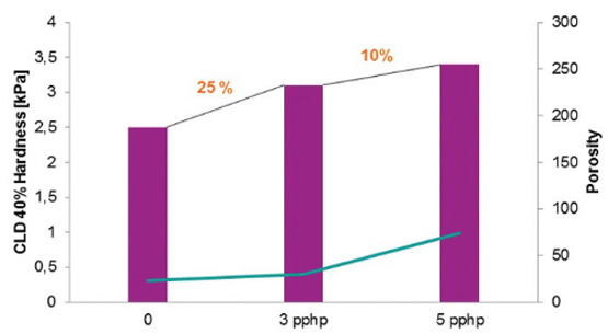 與市場(chǎng)上的其他硬化添加劑不同,NT H18可顯著提高硬度,同時(shí)不影響泡沫的孔結(jié)構(gòu)。當(dāng)NT H18添加到配方中時(shí),沒(méi)有必要改變TDI或錫的量來(lái)維持開(kāi)孔結(jié)構(gòu)。使用量為1至5pphp,取決于所需的硬度增加。取決于泡沫密度,配方和生產(chǎn)參數(shù),可以在不顯著改變孔結(jié)構(gòu)的情況下提高35%的硬度。