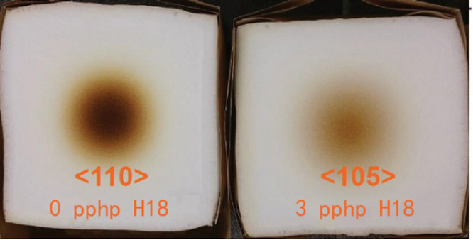NT H18不僅可用于增加硬度,還可用于減少配方中TDI,聚合多元醇或錫的含量,同時(shí)保持海綿硬度。因此,如果需要,它可用于降低成本,并促進(jìn)工藝條件(反應(yīng)溫度)。如表2所示,在參考配方實(shí)驗(yàn)室條件下,密度為21kg/m3海綿中添加3pphp的NT H18,將TDI指數(shù)從105降低到100,硬度保持幾乎恒定,并且可顯著改善海綿黃化問(wèn)題,如圖二所示。